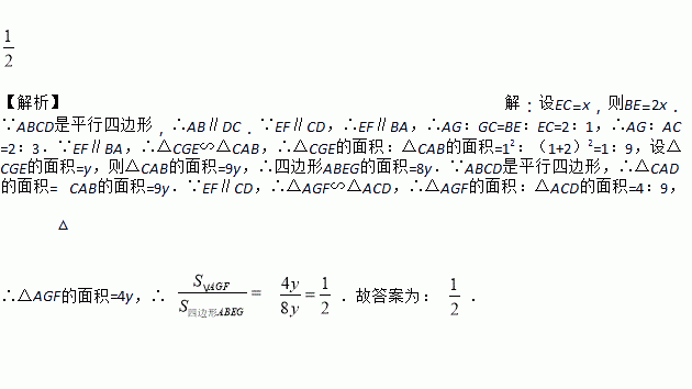 如图,平行四边形ABCD中,点E,F分别在BC,AD上,且BE:EC=2:1,EF∥CD,交对角线AC于点G,则_____________。