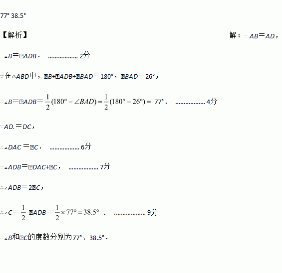 如图,在△ABC中,AB=AD=DC,∠BAD=26°.求∠B和∠C的度数![]()