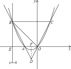 如图,直线x=-4与x轴交于点E,一开口向上的抛物线过原点交线段OE于点A,交直线x=-4于点B,过B且平行于x轴的直线与抛物线交于点C,直线OC交直线AB于D,且AD:BD=1:3.