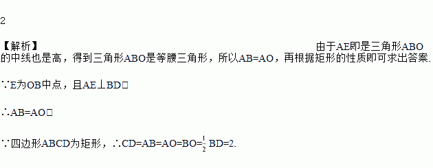 如图,矩形ABCD中,对角线AC、BD交于点O,E为OB中点,且AE⊥BD,BD=4,则CD=____________________.