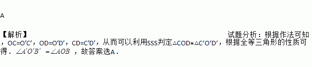 A 【解析】试题分析:根据作法可知,OC=O′C′,OD=O′D′,CD=C′D′,从而可以利用SSS判定△COD≌△C‘O‘D‘,根据全等三角形的性质可得.,故答案选A.