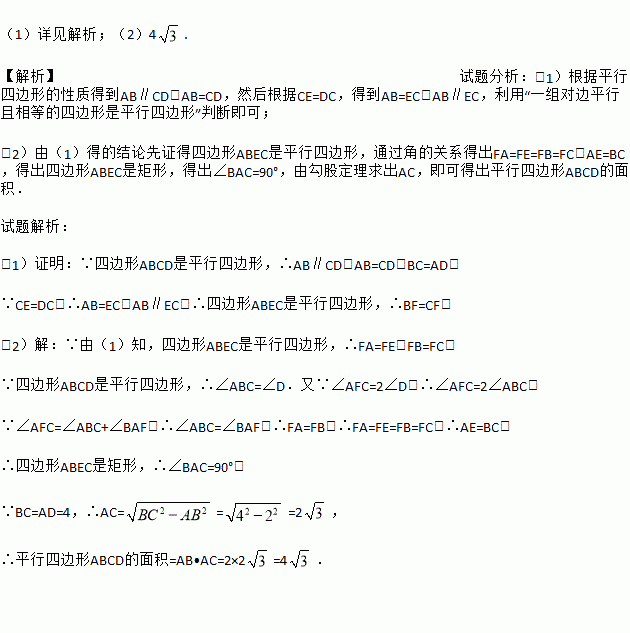 (2)若AB=2,AD=4,且∠AFC=2∠D,求平行四边形ABCD的面积.
