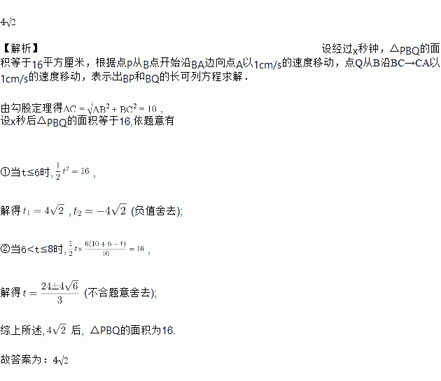 在△ABC中,∠B=90°,AB=8,BC=6.点P从点B沿BA向A以1 cm/s向A移动,到A后停止;同时,点Q从B沿BC→CA以1 cm/s移动到终点A,_______秒后,△PBQ的面积为16.