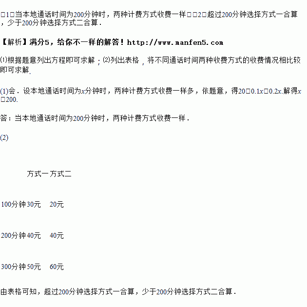 (1)对于某本地通话时间,会出现按两种计费方式收费一样的情况吗?