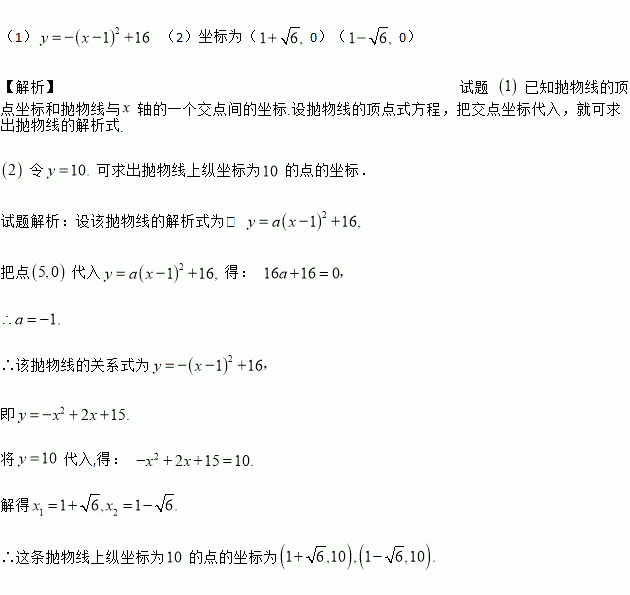 若抛物线的顶点坐标是A(1,16),并且抛物线与轴一个交点坐标为(5 ,0).