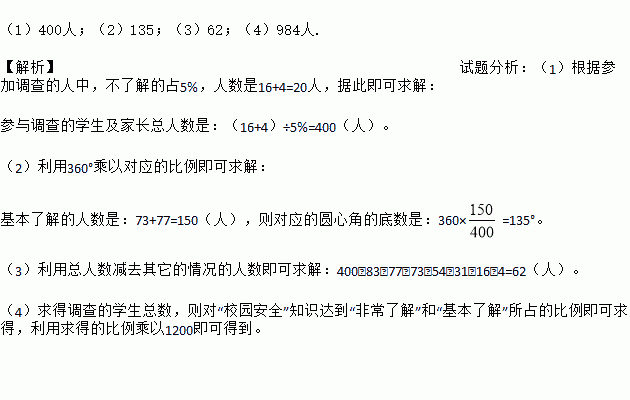 (4)若全校有1200名学生,请你估计对“校园安全”知识达到“非常了解”和“基本了解”的学生共有多少人.