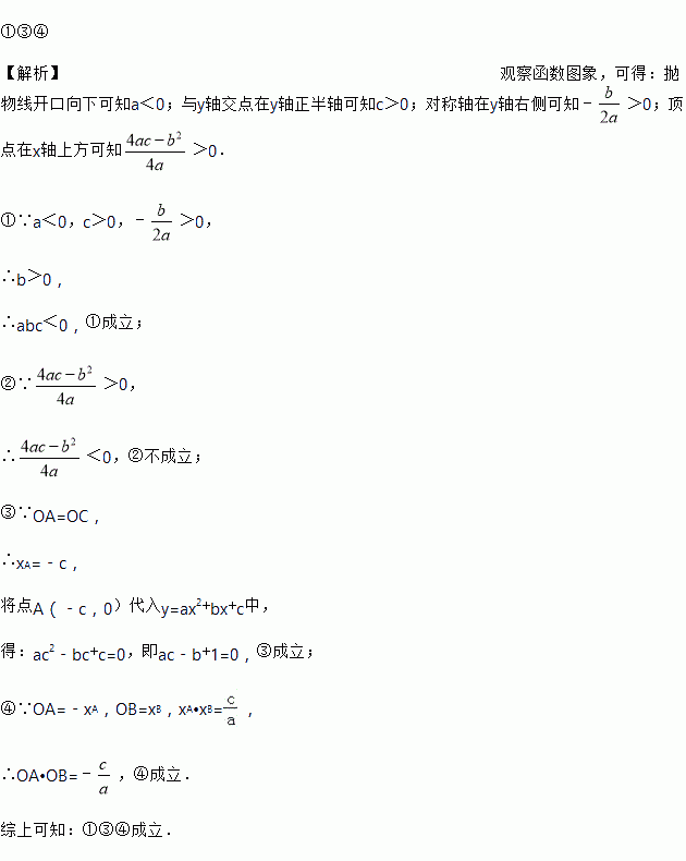 如图,二次函数y=ax2+bx+c(a≠0)的图象与x轴交于A,B两点,与y轴交于点C,且OA=OC,则下列结论:①abc<0;②