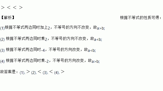 (3)若-4a>-4b,则a______b;