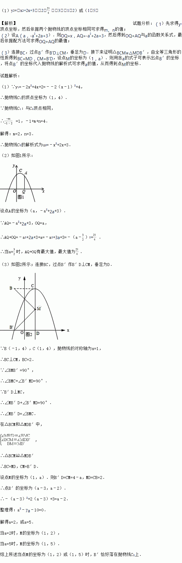 (2)点A是抛物线C2上在第一象限的动点,过A作AQ⊥x轴,Q为垂足,求AQ+OQ的最大值.