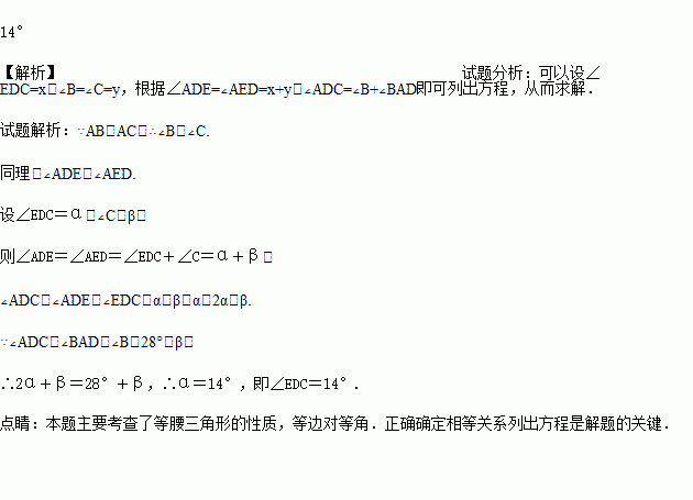 如图,在△ABC中,已知AB=AC,AD=AE,∠BAD=28°,求∠EDC的度数.