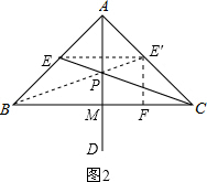 ∴作E点关于AD的对称点E′,连接BE′,交AD于点P,此时BP+EP最小,