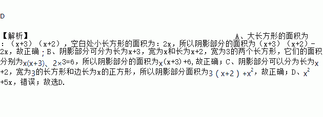 D 【解析】A、大长方形的面积为:(x+3)(x+2),空白处小长方形的面积为:2x,所以阴影部分的面积为(x+3)(x+2)-2x,故正确;B、阴影部分可分为长为x+3,宽为x和长为x+2,宽为3的两个长方形,它们的面积分别为x(x+3)、2×3=6,所以阴影部分的面积为x(x+3)+6,故正确;C、阴影部分可以分为长为x+2,宽为3的长方形和边长为x的正方形,所以阴影部分面积为3(x+2...