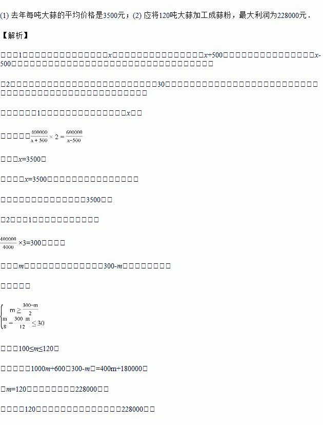 (1)试问去年每吨大蒜的平均价格是多少元?