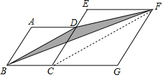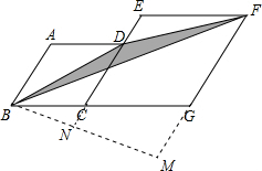 14.分析 作BM⊥FG于M,交EC于N,如图,根据菱形的性质得BC=CD=3,CG=GF=4,AB∥CE∥GF,∠ABC=∠BCD=∠CGF=120°,则∠BCN=∠BGM=60°,再根据含30度的直角三角形三边的关系,在Rt△BCN中可计算出BN=$\sqrt{3}$CN=$\frac{3\sqrt{3}}{2}$,在Rt△BMG中可计算出BM=$\sqrt{3}$GM=$\frac{7\sqrt{3}}{2}$,则MN=BM-BN=$\frac{7\sqrt{3}}{2}$-$\frac{3\sqrt{3}}{2}$=2$\sqrt{3}$,然后根据三角形面积公式和梯形面积公式,利用S阴影部分=S△BCD+S梯形CDFG-S△BGF进行计算即可.另一种解法为把阴影部分的面积转化为△BCD的面积进行计算.