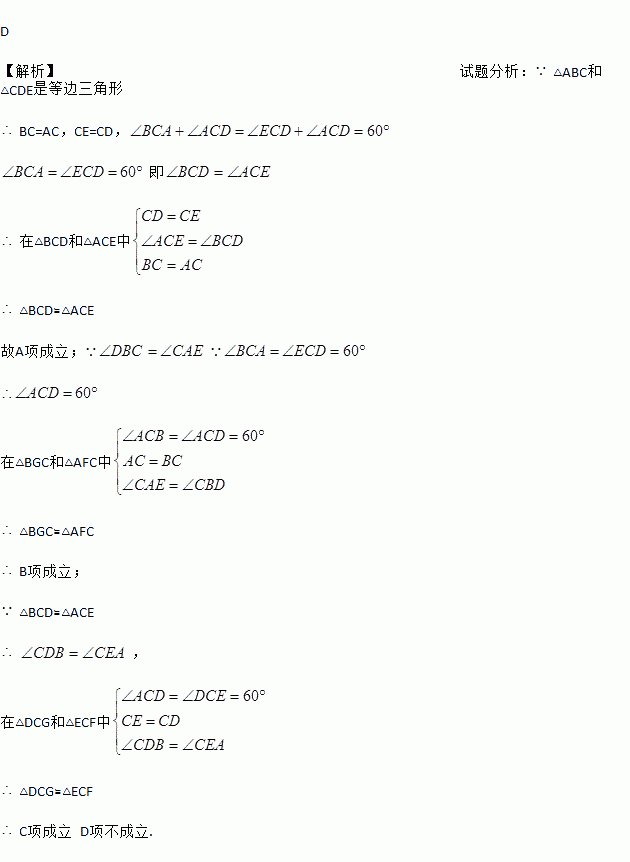 A. △ACE≌△BCD B. △BGC≌△AFC C. △DCG≌△ECF D. △ADB≌△CEA