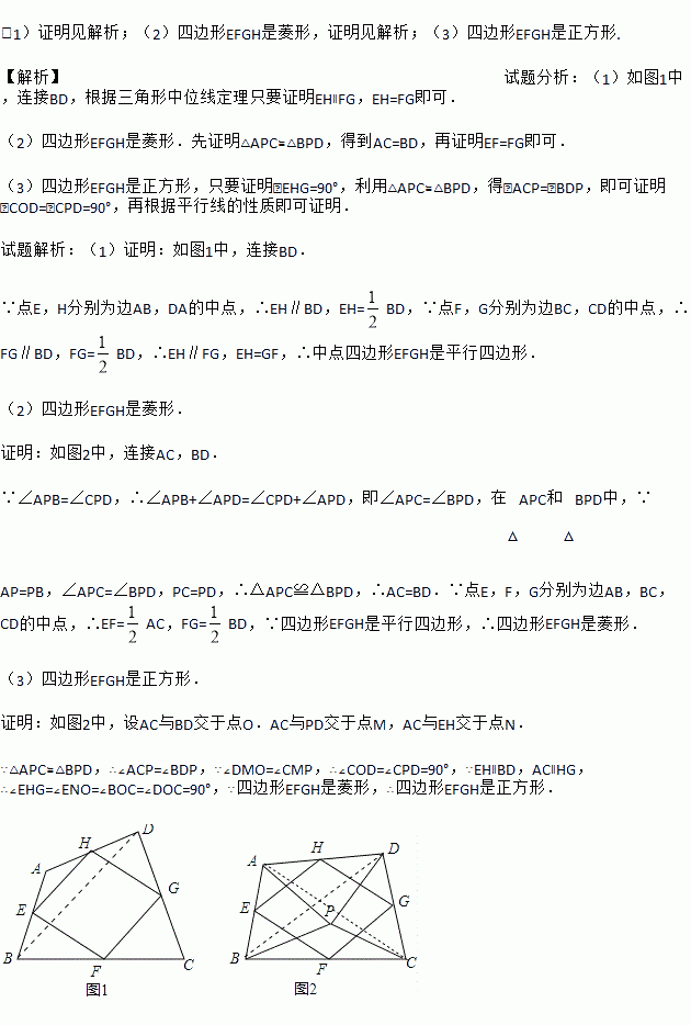 (3)若改变(2)中的条件,使∠APB=∠CPD=90°,其他条件不变,直接写出中点四边形EFGH的形状.(不必证明)