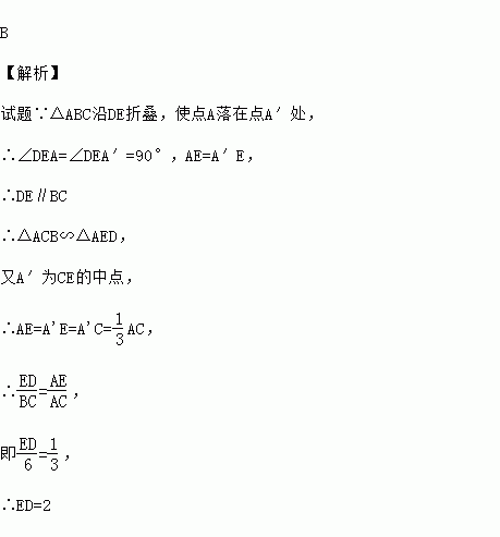 (2011•河北)如图,在△ABC 中,∠C=90°,BC=6,D,E 分别在 AB、AC上,将△ABC沿DE折叠,使点A落在点A′处,若A′为CE的中点,则折痕DE的长为( )