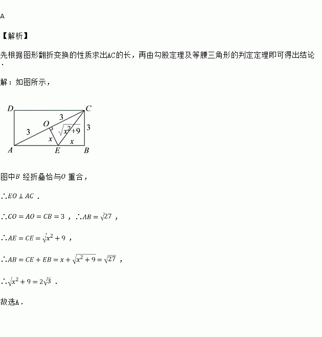 如图,点O是矩形ABCD的对称中心,E是AB边上的点,沿CE折叠后,点B恰好与点O重合,若BC=3,则折痕CE= ( )