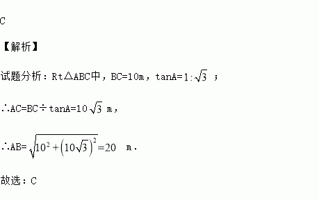 如图,河堤横断面迎水坡AB的坡比是,堤高BC=10m,则坡面AB的长度是( )