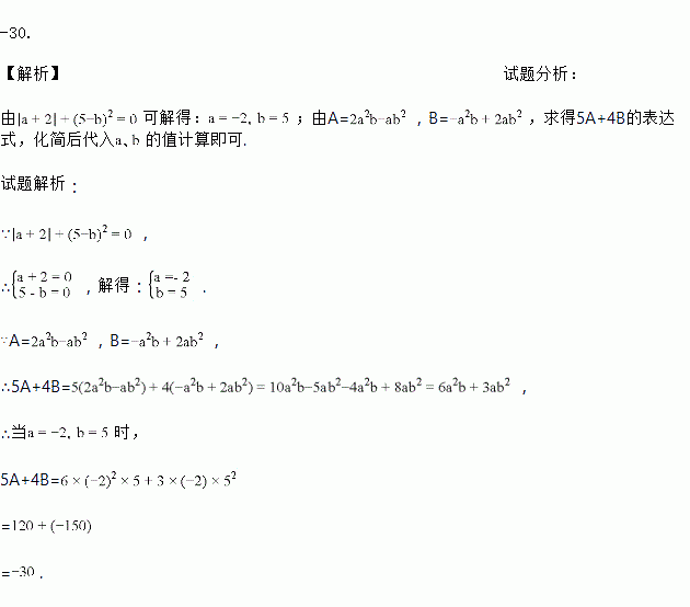 -30. 【解析】试题分析: 由可解得:;由A=,B=,求得5A+4B的表达式,化简后代入的值计算即可. 试题解析: ∵, ∴,解得: . ∵A=,B=, ∴5A+4B=, ∴当时, 5A+4B= = =.