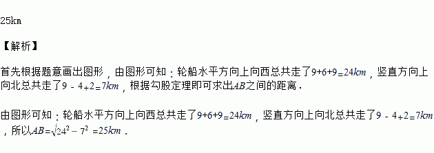 轮船从海中岛A出发,先向北航行9km,又往西航行9 km,由于遇到冰山,只好又向南航行4 km,再向西航行6 km,再折向北航行2 km,最后又向西航行9 km,到达目的地B,求AB两地间的距离.