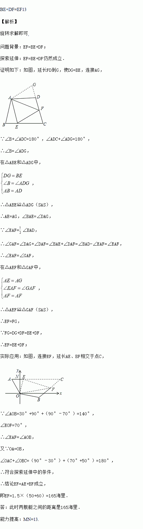 如图1,在四边形ABCD中,AB=AD,∠BAD=120°,∠B=∠ADC=90°,EF分别是BC,CD上的点,且∠EAF=60°,探究图中线段BE,EF,FD之间的数量关系.