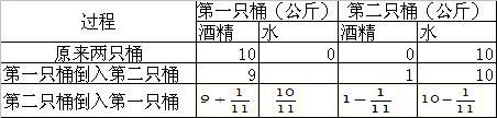 分析:两只桶酒精与水的交换过程如下:由图中计算出第一只桶中酒精所占比例和第二只桶中水所占的比例,比较大小.