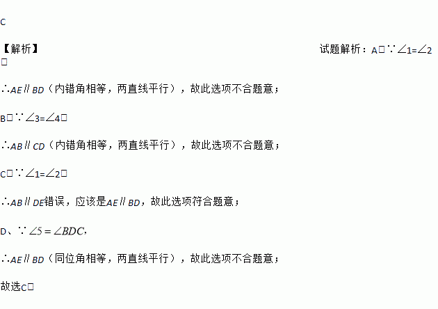 C. ∵∠1=∠2,∴AB∥DE D. ∵∠5=∠BDC,∴AE∥BD