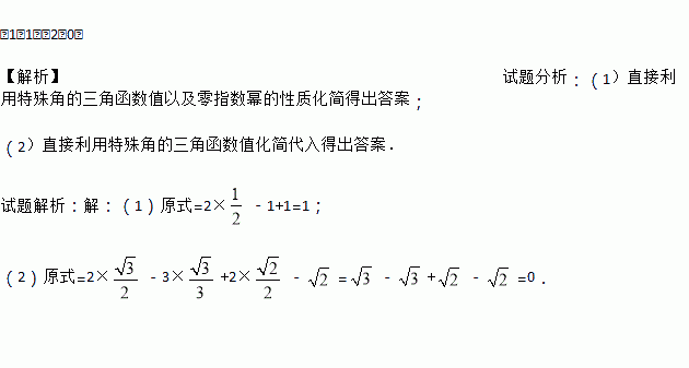 (1)2cos60°﹣(2009﹣π)0+tan45°.