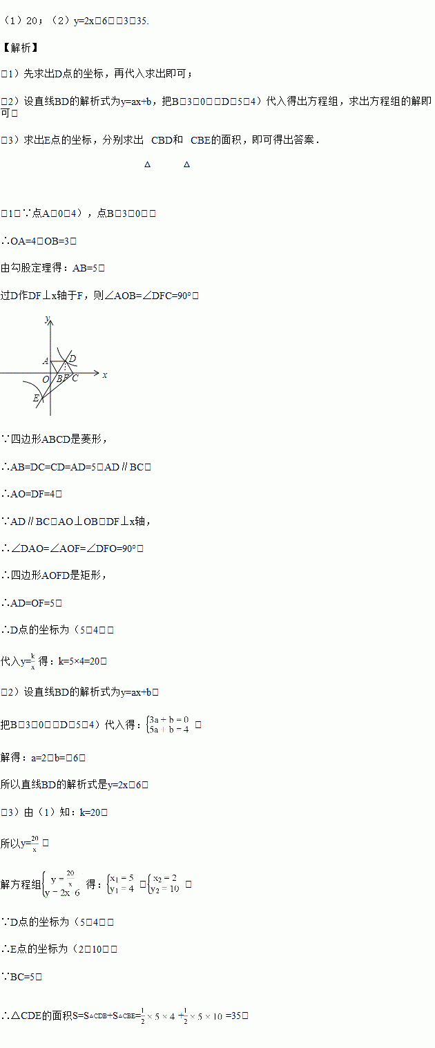 如图所示,四边形ABCD是菱形,边BC在x轴上,点A(0,4),点B(3,0),双曲线y=与直线BD交于点D、点E.