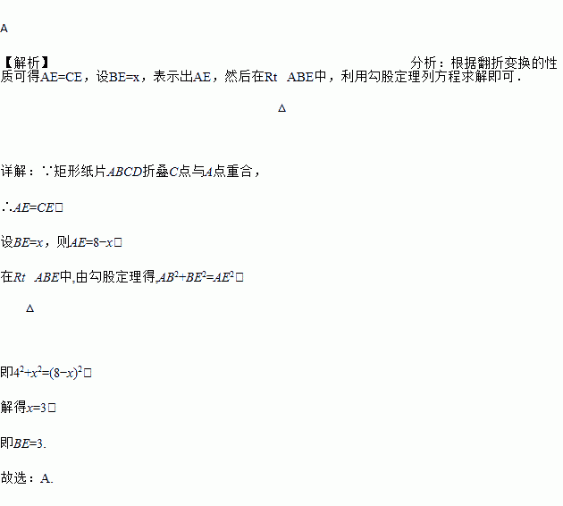 如图,将一个矩形纸片ABCD折叠,使C点与A点重合,折痕为EF.若AB=4,BC=8,则BE的长是( )