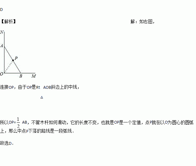 木杆AB斜靠在墙壁上,当木杆的上端A沿墙壁NO竖直下滑时,木杆的底端B也随之沿着射线OM方向滑动.下列图中用虚线画出木杆中点P随之下落的路线,其中正确的是( )