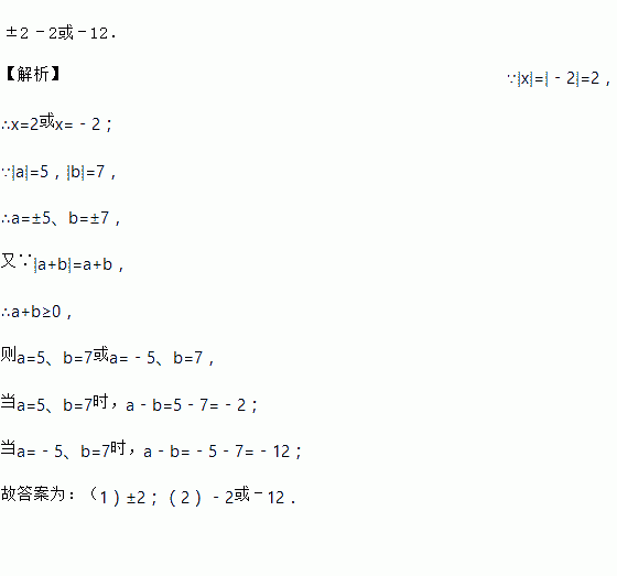 若|x|=|﹣2|,则x=______;已知|a|=5,|b|=7,且|a+b|=a+b,则a﹣b的值为______.