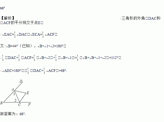 如图,在△ABC中,∠B=44°,三角形的外角∠DAC与∠ACF的平分线交于点E,则∠AEC=_____.