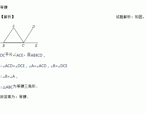 等腰 【解析】试题解析:如图, DC平分∠ACE,且AB∥CD, ∴∠ACD=∠DCE,∠A=∠ACD,∠B=∠DCE ∴∠B=∠A, ∴△ABC为等腰三角形. 故答案为:等腰.
