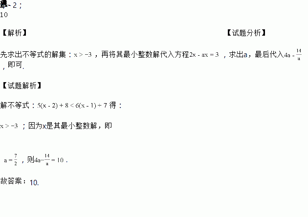若不等式5(x-2)+8<6(x-1)+7的最小整数解是方程2x-ax=3的解,求4a-的值。