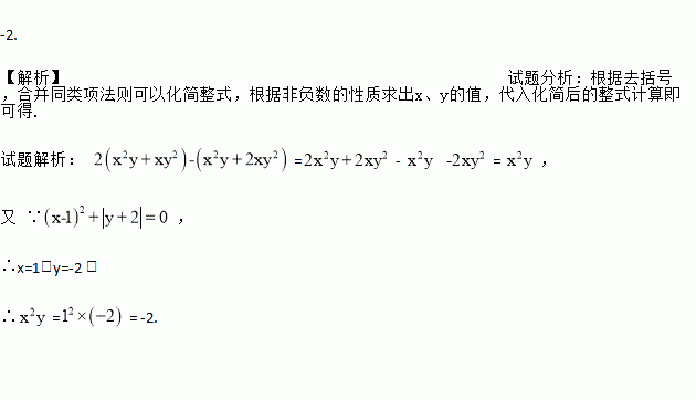 先化简再求值:求2(x2y+xy2)-( x2y+2xy2)的值,其中(x-1)2+|y+2|=0.