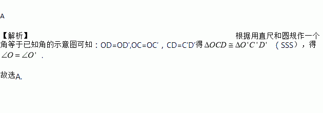 A 【解析】根据用直尺和圆规作一个角等于已知角的示意图可知:OD=OD’,OC=OC’,CD=C’D’得 (SSS),得 . 故选A.
