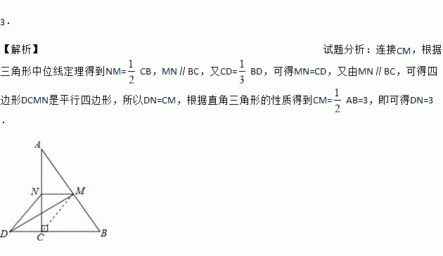 如图,在△ABC中,∠ACB=90°,M、N分别是AB、AC的中点,延长BC至点D,使CD=BD,连接DM、DN、MN.若AB=6,则DN=___.