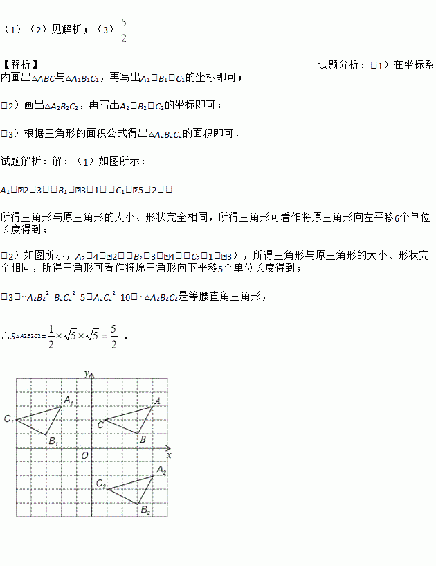 (2)将三角形ABC三个顶点的纵坐标都减去5,分别得到A2、B2、C2,依次连接A2,B2,C2,各点,请写出A2、B2、C2的坐标并画出△A2B2C2,并判断所得三角形A2B2C2与三角形ABC的大小、形状和位置有什么关系?