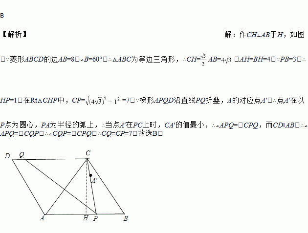 (2016湖北省鄂州市)如图,菱形ABCD的边AB=8,∠B=60°,P是AB上一点,BP=3,Q是CD边上一动点,将梯形APQD沿直线PQ折叠,A的对应点A′.当CA′的长度最小时,CQ的长为( )