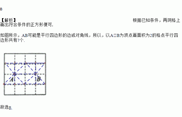 下图是4×4的正方形网格,每个小正方形的边长为1,每个小正方形的顶点叫格点,点A、B(均在格点上)的位置如图,若以A、B为顶点画面积为2的格点平行四边形,则符合条件的平行四边形的个数有( )