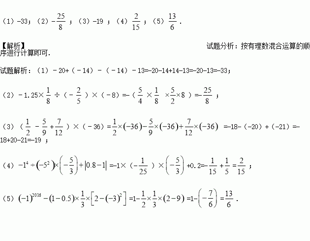 (1)﹣20+(﹣14)﹣(﹣14)﹣13 (2)﹣1.25×÷(﹣)×(﹣8)