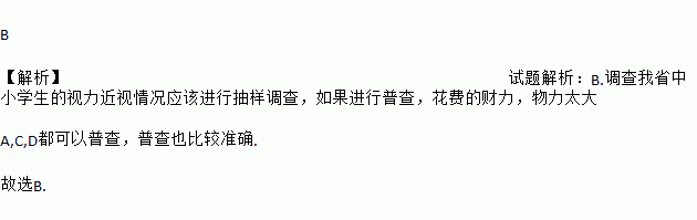 A. 调查某校七(2)班同学的体重情况 B. 调查我省中小学生的视力近视情况