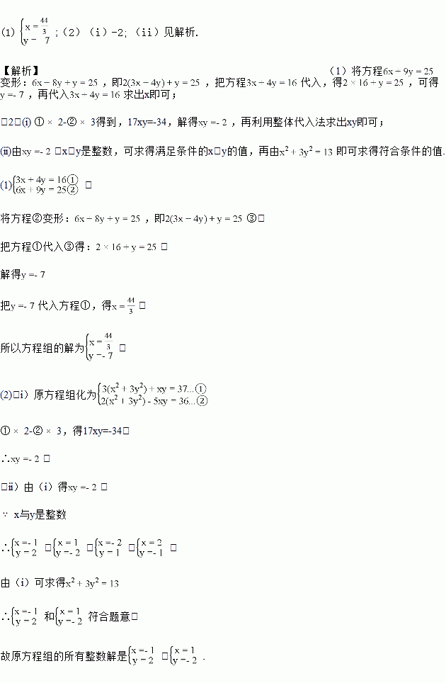把y=–1代入方程①,得x=4,所以方程组的解为![]()