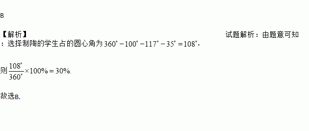 如图,某实验中学制作了学生选择象棋、曲艺、园艺、制陶四门业余课程情况的扇形统计图,从中可以看出选择制陶的学生占( )