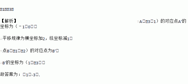 (1,﹣3) 【解析】∵A(﹣3,1)的对应点A′的坐标为(﹣1,0), ∴平移规律为横坐标加2,纵坐标减1, ∵点B(﹣1,﹣2)的对应点为B′, ∴B′的坐标为(1,﹣3). 故答案为:(1,-3).
