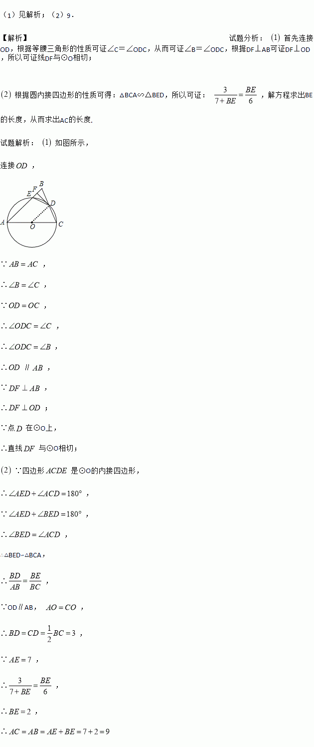 如图,在△ABC中,AB=AC,以AC为直径的⊙O交BC于点D,交AB于点E,过点D作DF⊥AB,垂足为F,连接DE.