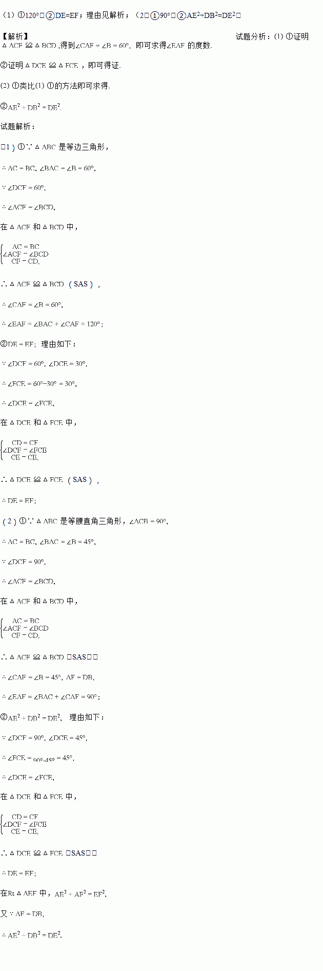 (1)操究发现:如图1,△ABC为等边三角形,点D为AB边上的一点,∠DCE=30°,∠DCF=60°且CF=CD