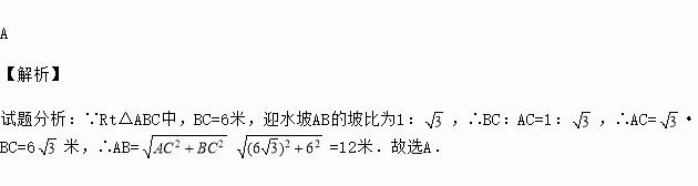 河堤横断面如图所示,堤高BC=6米,迎水坡AB的坡比为1:,则AB的长为( )